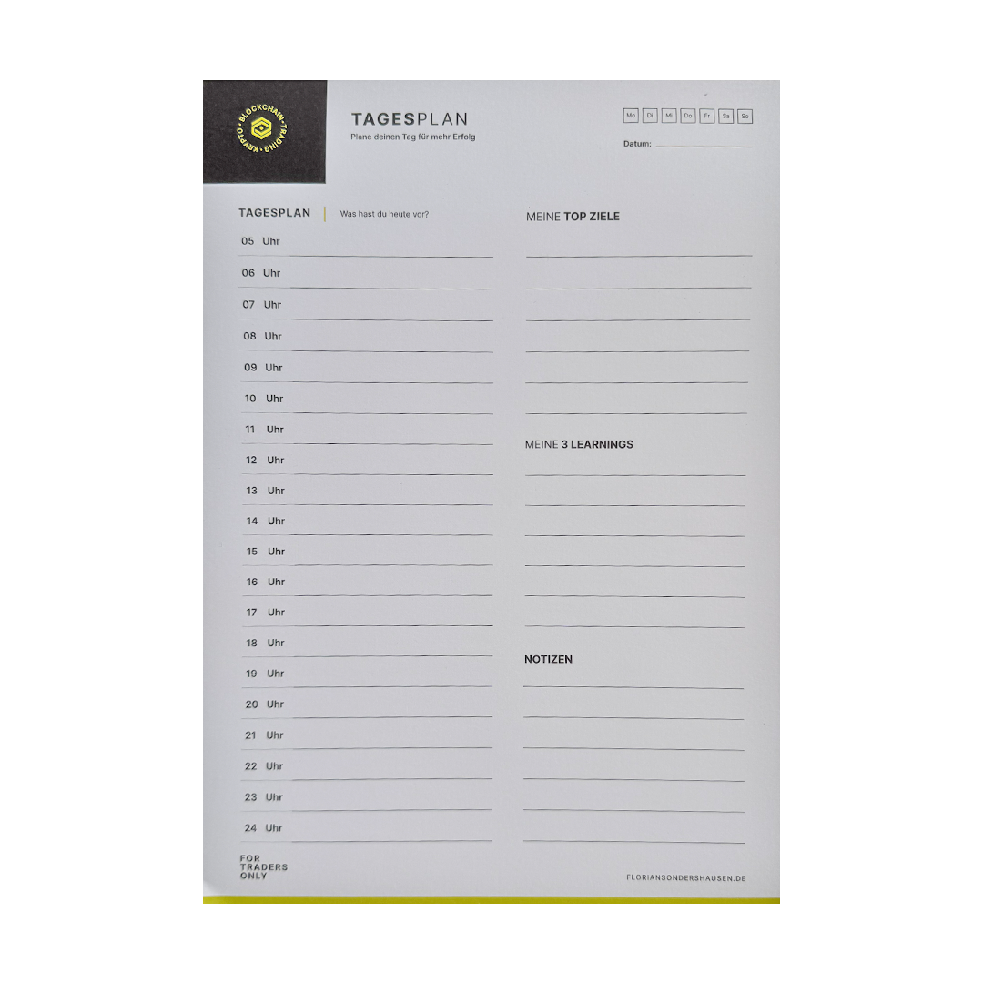 Der "For Traders Only" Tagesplaner-Block ist dein unverzichtbares Tool, um deinen Tag optimal und strategisch deine Trading-Ziele im Blick zu behalten. Ob du deine Aufgaben strukturieren, wichtige Meetings planen, oder deine Tradingsession einteilen möchtest, mit diesem Planer behältst du jederzeit die Kontrolle über deinen Chart und kannst dank der Übersicht dein Trade festhalten, um daraus weiterzuwachsen.